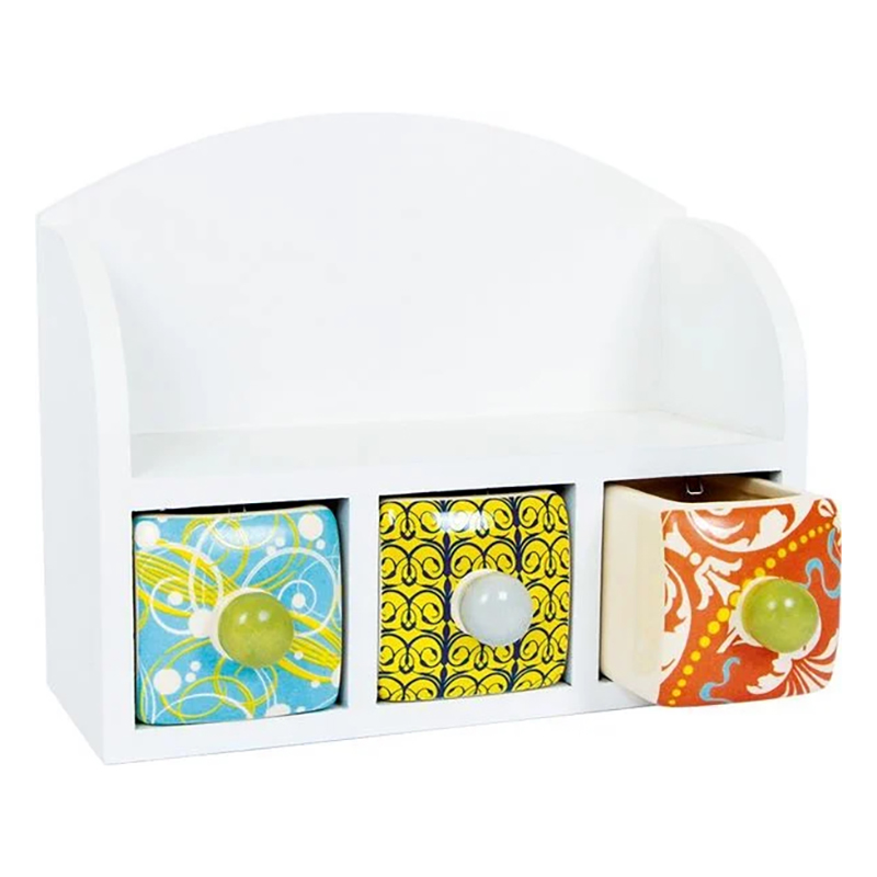 Enten små skrivebordsredskaper, kosmetikk eller potteblomster, setter denne hvite trehyllen vakre og nyttige ting i rampelyset. De tre fargerikt malte keramikkskuffene gir plass til blyantspissere og binders eller øyenskygge og leppestift. Små metallpropper hindrer skuffene i å falle ut.