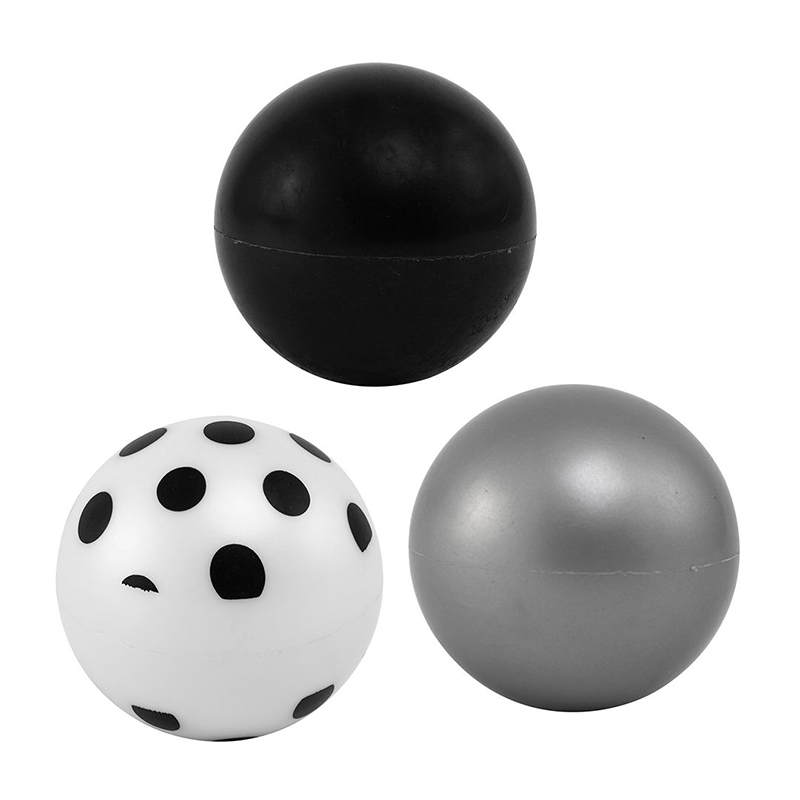 3 baller, sort, grå og hvit med prikker. 9 cm.