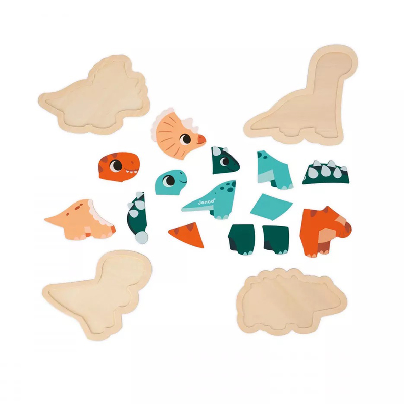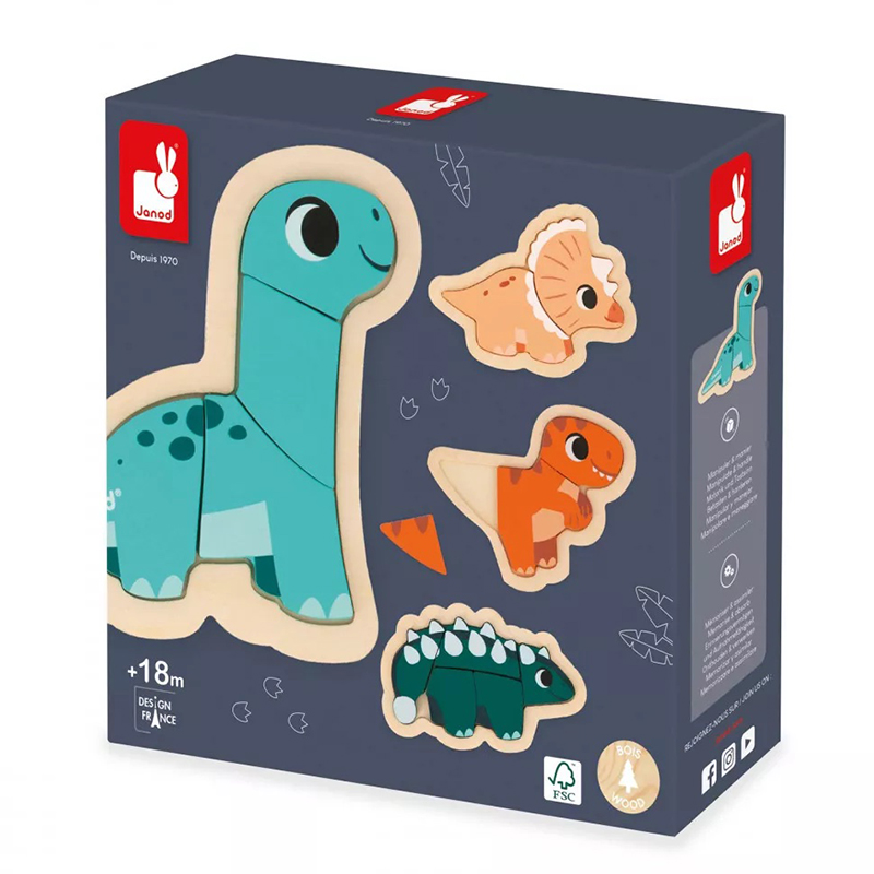 Kaller alle små dinosaurfans! 4 vakre figurer er klar til å underholde de små, samtidig som de får dem til å tenke! Se på disse 4 ultrasøte progressive trepuslespillene for babyer fra 18 måneder og oppover! Begynn med puslespillet i 2 deler og øk deretter gradvis vanskelighetsgraden, opp til modellen med 5 deler. La oss bringe 2-delt Triceratops, 3-delt T-Rex, 4-delt Diplodocus og 5-delt Ankylosaurus tilbake til livet. For å gjøre dette tidlige årsspillet enda enklere, er trepuslespillbrikkene plassert i 4 baser. Dette tidlige læringspuslespillet er ideelt for å utvikle de smås fingerferdighet. Laget av FSC®-tre.