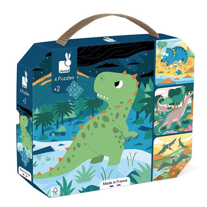 En forhistorisk reise venter på dine små oppdagere! Med disse 4 utviklende puslespillene med dinosaur-tema kan barn fra 2 år og oppover utforske juraperioden. Hvert puslespill – sammensatt av henholdsvis 6, 9, 12 og 16 brikker – vil hjelpe barnet ditt til å utvikle seg, samtidig som det stimulerer finmotorikken og konsentrasjonen. En utfordring som passer for alle aldre! Hvert puslespill har en bakside i forskjellig farge, noe som hjelper de små med å enkelt sette sammen de 4 puslespillene. Dessuten passer de store brikkene perfekt i små hender, noe som gjør leken morsommere og morsommere. En morsom reise gjennom tiden: forestill deg barnets glede når de setter delene sammen for å avsløre en majestetisk dinosaur, mens du lærer å gjenkjenne de forskjellige artene! Det er en fin måte å kombinere lek og læring på. Praktisk: disse puslespillene kommer i en bæreveske med håndtak slik at barn kan ta dem med seg hvor de vil. Enten du skal på tur eller besøke besteforeldrene, kan den lille helt sikkert ta med seg denne rolige og stimulerende aktiviteten. Så, er du klar til å legge ut på en reise gjennom tiden med dinosauroppgavene våre? Disse puslespillene er laget i Frankrike av FSC™-papp og dekorert med vegetabilsk blekk.