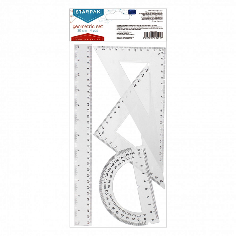 Transportør 9 cm, 30 cm linjal, 45 grader vinkel og 60 grader vinkel.
