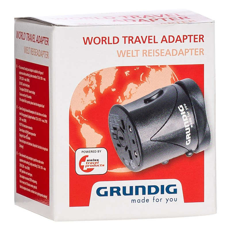 Reiseadapter fra Grundig som lar deg plugge inn dine elektriske apparater de fleste steder i verden. Dekker mer enn 150 land og er tilpasset følgende regioner: EU, Storbritannia, USA og australia. Konverterer ikke volt og bør ikke brukes sammen med hårfønere.