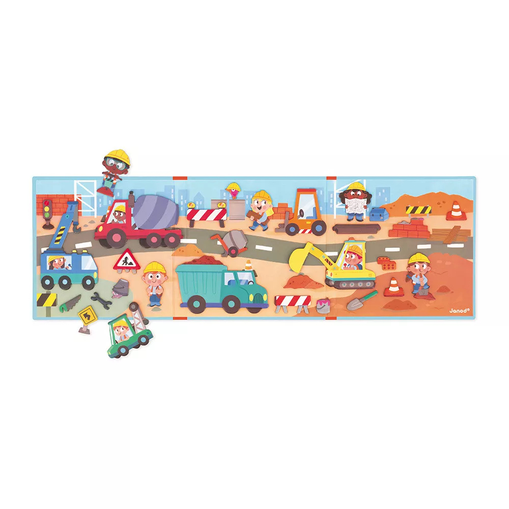 Betongblanderen er på denne måten! Marie, tok du med borrhammeren din? Dette magnetiske spillet med byggeplasstema vil tjene som utgangspunkt for de beste historiene og passer for barn fra 3 år og oppover. De vil kunne stimulere fantasien og jobbe med finmotorikken ved å flytte magnetene rundt i bakgrunnen. Faktisk består dette magnetiske spillet av et illustrert magnetisk bakteppe og 30 magnetiske brikker. Det praktiske formatet til dette spillet med konstruksjonstema gir enkel transport, så det er bare fantasien til barnet som setter grenser! Enten du er hjemme eller ute, vil barnet ditt kunne drømme om å bli en ekte byggeplassleder. De vil da kunne planlegge og overvåke arbeidet som om de var en arkitekt, eller til og med klatre ombord i sementblanderen eller traktorgraveren! Når magnetene er plassert på bakteppet, kan barna reise dem vertikalt for å hjelpe med å fortelle historiene deres. Dette magnetiske spillet med byggeplasstema er en del av den store samlingen Magnéti’s stories som effektivt fremmer fantasien. Dette magnetiske spillet er laget av FSC™-sertifisert papp, i tillegg til kontrollerte materialer.