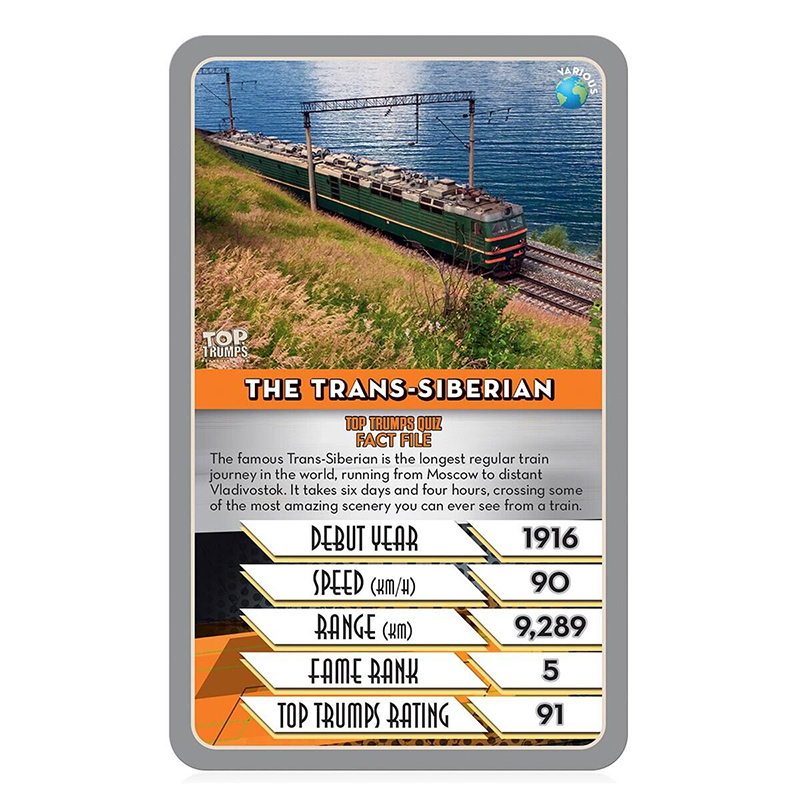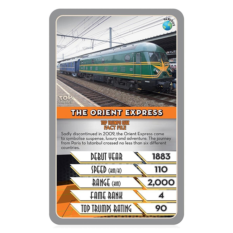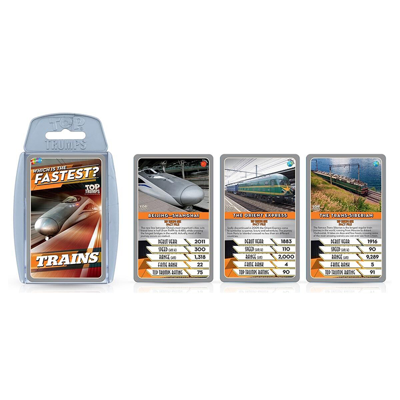 - Finn ut når London Underground debuterte, hastigheten til et tysk ICE-tog (Inter City Express) og rekkevidden til Beijing-Shanghai-ruten i denne utgaven av Top Trumps – Trains