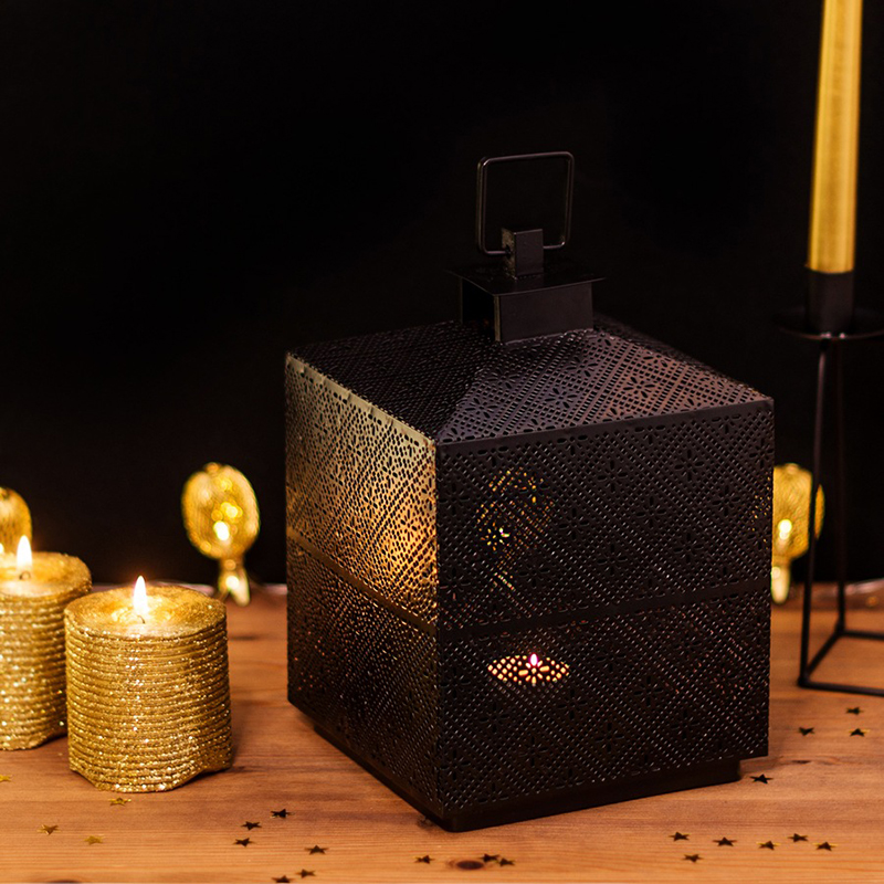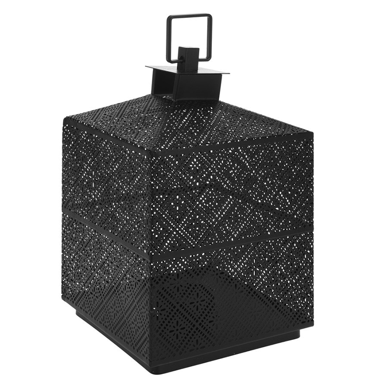 Stor lanterne i pulverlakkert sort metall. Den har mønster i alle sidene og lager med det et fint motiv når lyset settes inn. Den kan plasseres flatt eller henges i ringen som er på toppen.