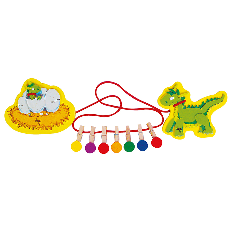 7 små klesklyper med fargekode, snor og oppheng med Dinosaurus dekor.