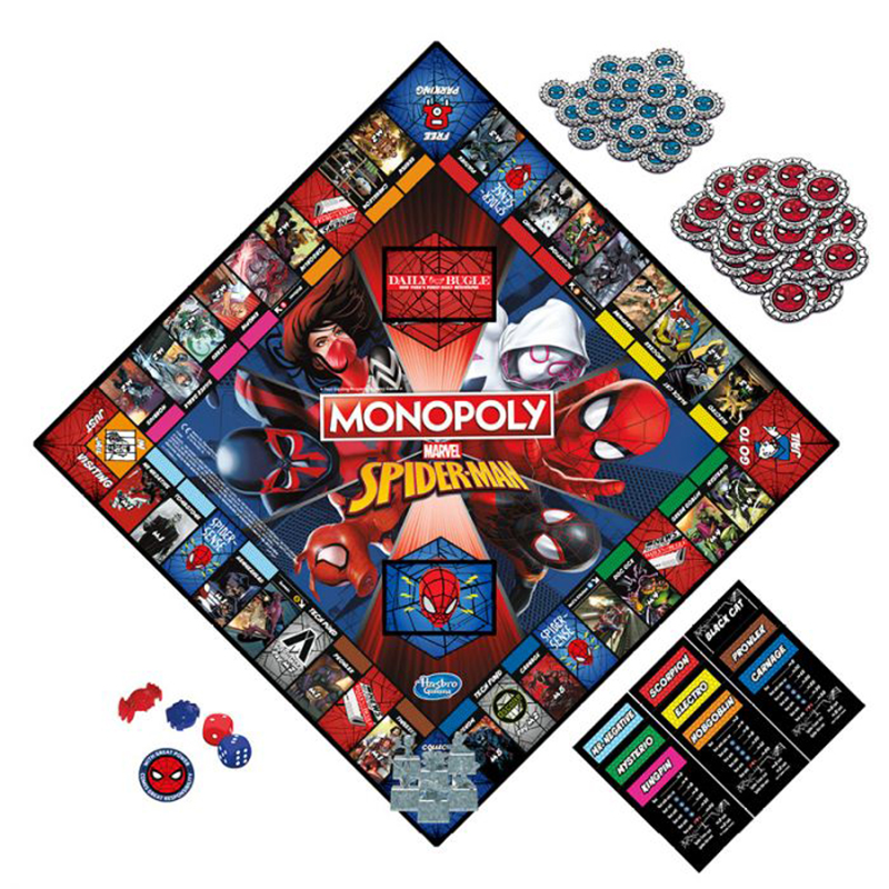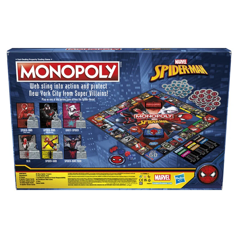 Spill etter klassiske MONOPOLY-regler eller bruk Spider-Mans valgfrie regel for et raskere spill! Inkluderer seks samleobjekter med Spider-Man-tema – Spider-Man i tre forskjellige positurer, Goblin 2, Venom og Sandman! Spillebrettet kommer med skjøtekort, sjanse- og fellesskapskort, MONOPOLY-penger og bankbrett, 2 terninger, 6 tokens, 32 leiligheter, 12 skyskrapere og instruksjoner. For 2-6 spillere.