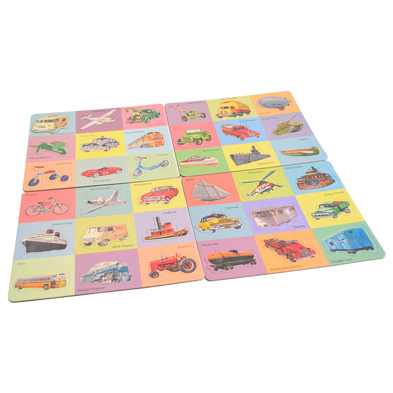 Innhold: 4 plater med 9 bilder/puslespillbrikker på hver, 36 lottobrikker.