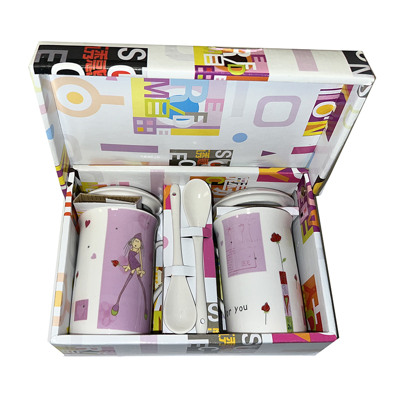 Sett av to kopper i keramikk med lokk og skje, rosa