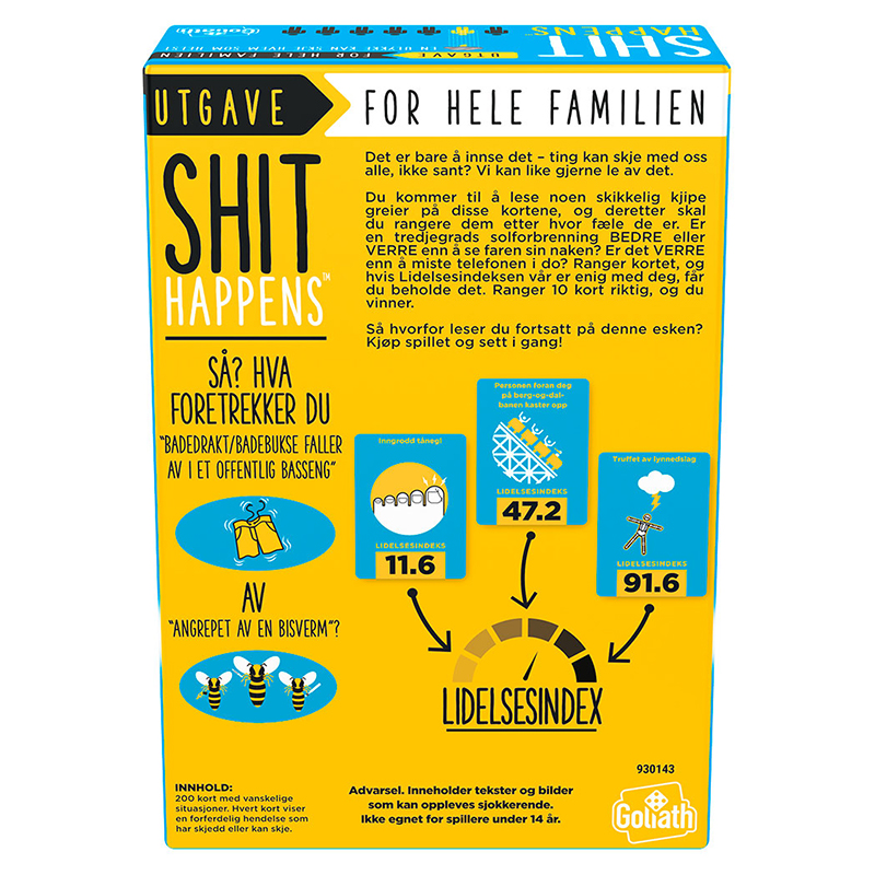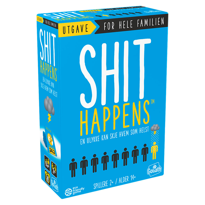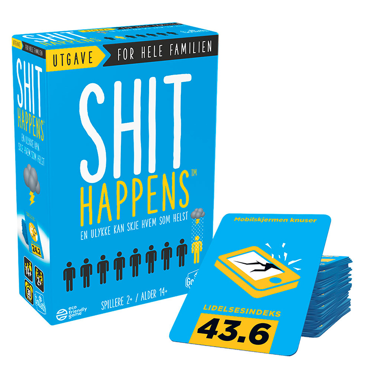 Shit happens-utgaven som nå også passer for hele familien! The Shit Happens Family Edition er et morsomt og frekk partyspill hvor du møter de verste situasjonene noensinne. Det er opp til spillerne å rangere dem riktig på Shit’O’Meter-skalaen fra 1 til 100.