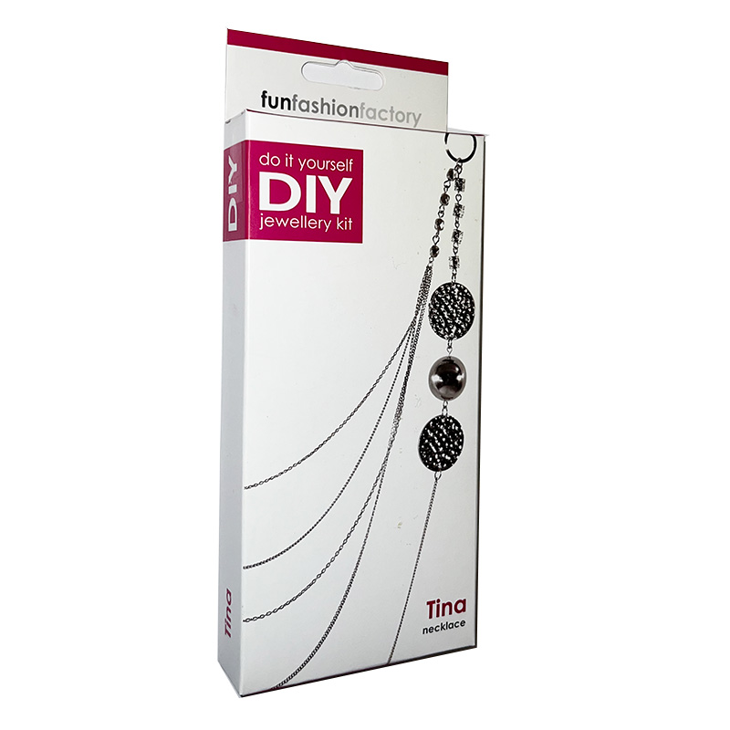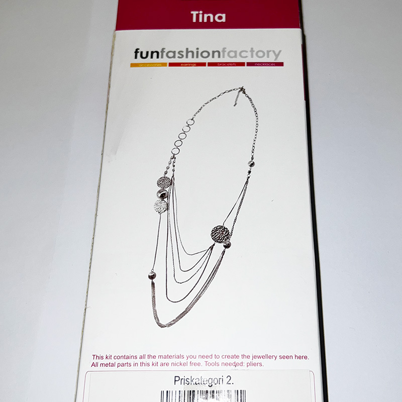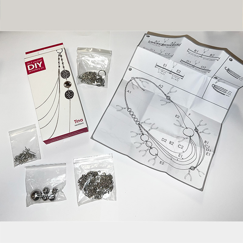 Du finner alle deler du trenger i esken til å lage et flott smykke selv. Det følger også med en illustrasjon.