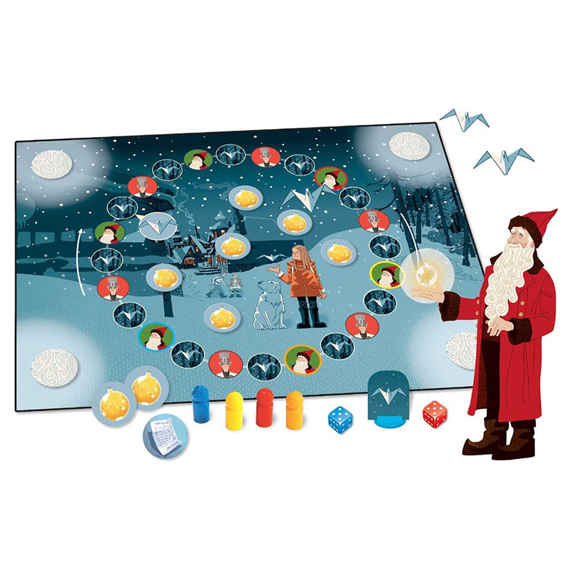 Spillet inneholder: Spillebrett, 4 spillebrikker, 12 brikker med julekuler, 4 brikker med sovetåke, 1 brevfuglbrikke med plastfot, 2 terninger og spilleregler.
