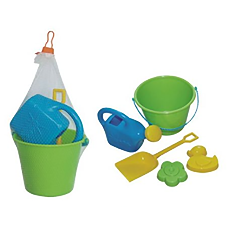 Strandlekesett 5 deler. Badeleker, sand, spade, bøtte, vannkanne.